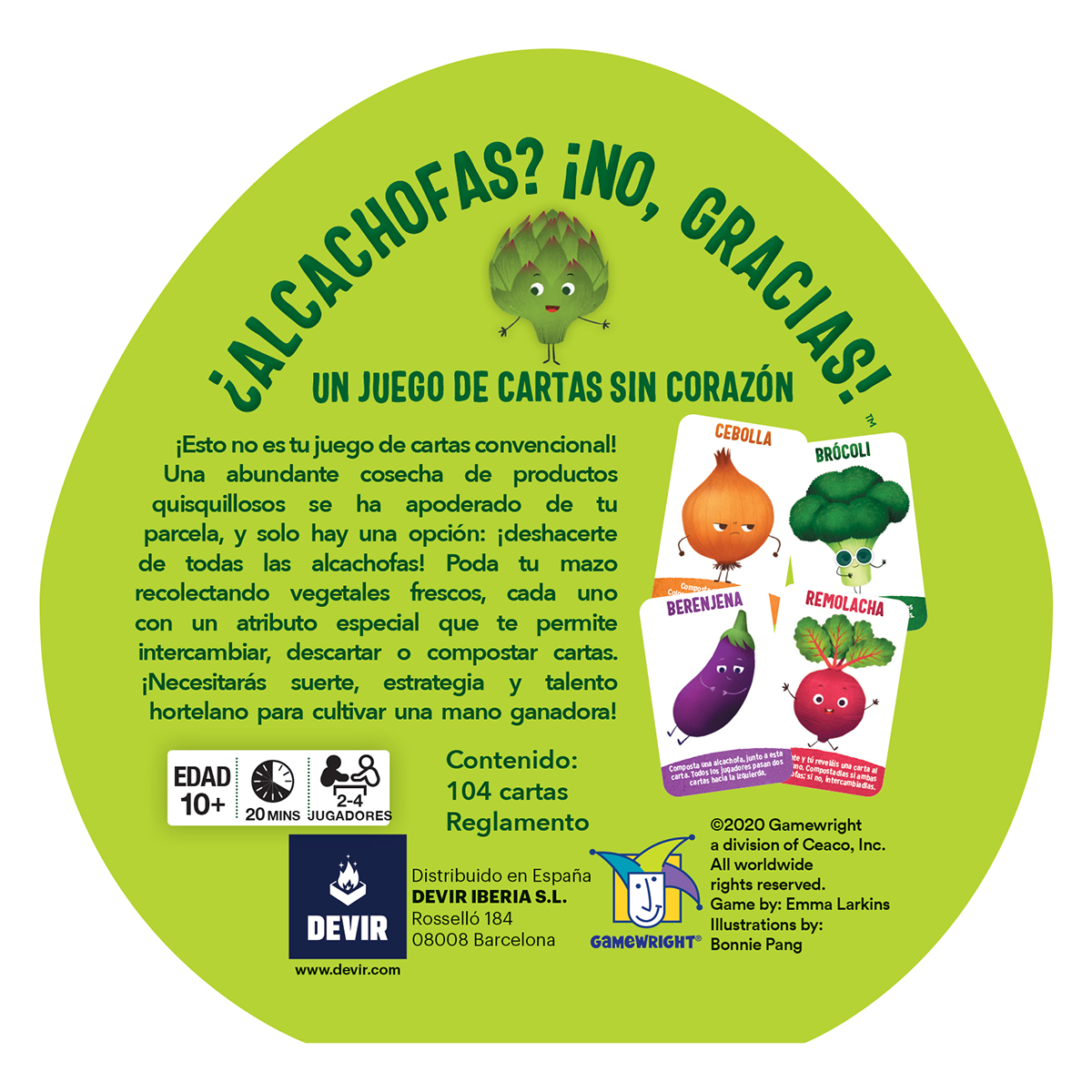 En tu huerto han crecido un montón de alcachofas… ¡Y debes librarte de ellas! Para recolectar la victoria en ¿Alcachofas? ¡No, gracias! deberás podar tus cartas hasta que solo te queden las verduras más frescas y sabrosas. Utilizarás los poderes de patatas, berenjenas, cebollas o zanahorias para intercambiar, descartar o compostar las alcachofas de tu mano. Este juego de creación y gestión de mazos, galardonado con el premio al Mejor Juego de Iniciación de 2021 en los American Tabletop Awards, promete haceros cosechar horas de diversión.