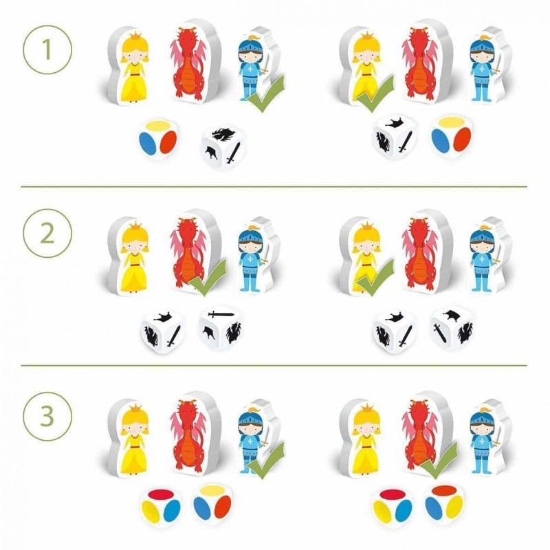 Paso 1: Coloca en la zona de juego las 3 figura (el caballero- la princesa y el dragón) y las 20 fichas de madera. Coge los dado necesarios para jugar a la variante del juego que elijáis. El ganador de cada ronda- acumula una ficha.