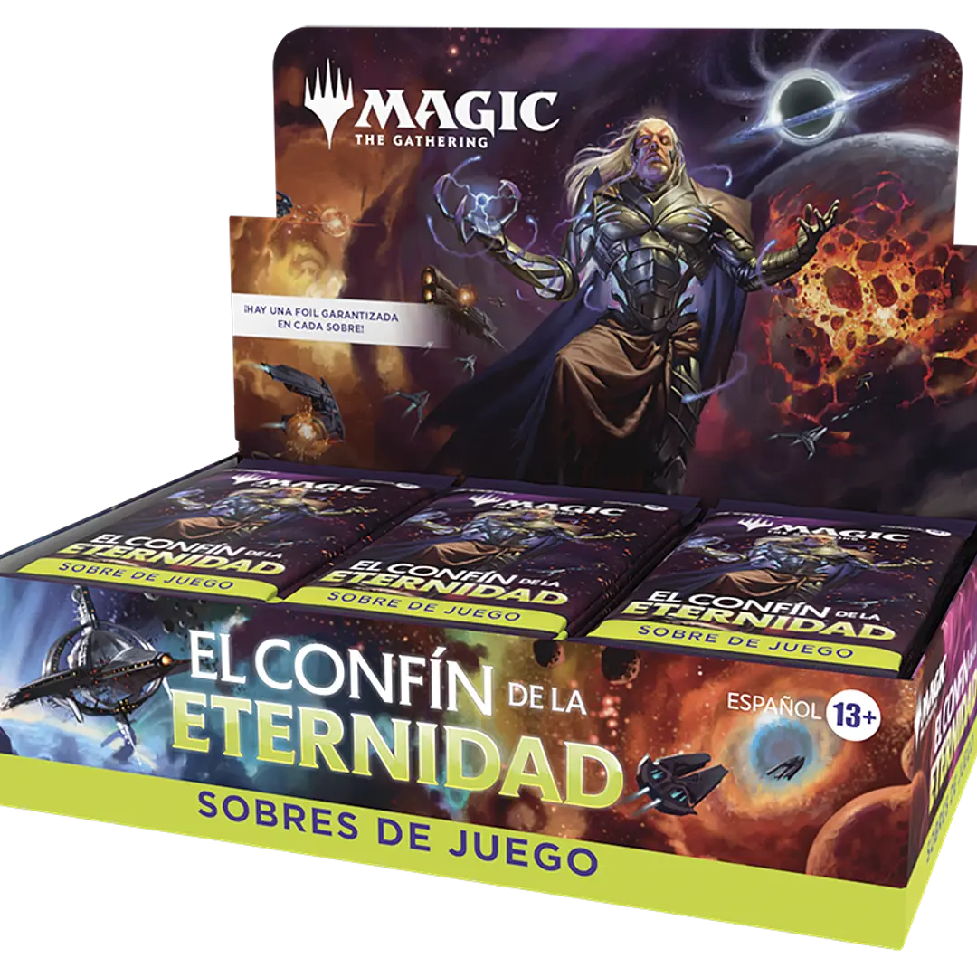 Contenido: 30 sobres de juego de El Confín de la Eternidad, cada uno con lo siguiente: 14 cartas de Magic: The Gathering Los sobres de juego pueden contener las siguientes cartas: 1 a 316 de EOE, 1 a 45 de EOS y 119 a 128 de SPG Incluye entre 1 y 4 cartas raras o de una rareza superior (2: 30 %, 3: 3 %, 4: <1 %), entre 3 y 5 poco comunes, entre 6 y 9 comunes y 1 carta de tierra 1 carta de cualquier rareza es foil tradicional Hay una carta rara mítica foil sin borde en menos del 1 % de los sobres Una tierra foil tradicional sustituye a una tierra en el 20 % de los sobres
