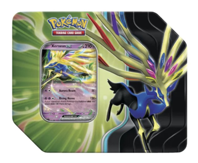 Con esta lata, podrás escoger entre las embravecidas olas de Kyogre ex, los afilados cuernos de Xerneas ex o el control temporal de Dialga ex, todos ellos