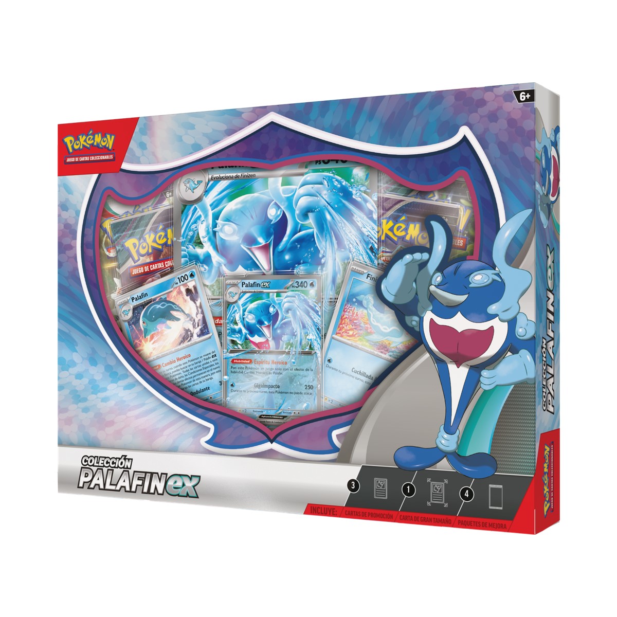 La colección Palafin ex de JCC Pokémon contiene: 1 carta holográfica de promoción de Palafin ex 2 cartas holográficas de Finizen y Palafin 1 carta holográfica de gran tamaño de Palafin ex 4 paquetes de mejora de JCC Pokémon 1 carta con código para JCC Pokémon Live